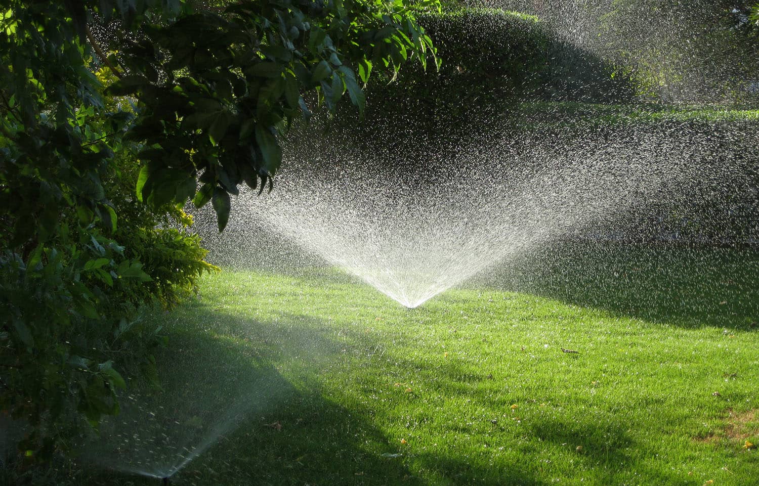 • Riego por aspersión: que consiste en el riego aéreo del jardín mediante aspersores y/o difusores, con el que se suele conseguir un porcentaje de área mojada cerca del 100%, es decir, se puede regar toda la superficie del jardín si el sistema de riego está bien dimensionado e instalado. Suelen tener una eficiencia de aplicación (EA) elevada, superior al 90-95% (es decir se riega de forma homogénea el 90-95% de la superficie).